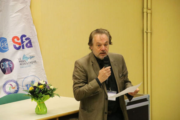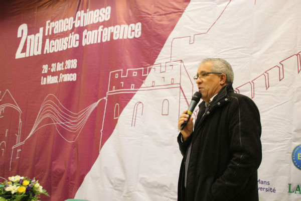 中国声学学会秘书长张春华先生致辞。他代表中国声学学会对本次会议的召开致以热烈的祝贺!对勒芒大学出色的组织工作表示尊敬和感谢。他向参会学者介绍了中国声学学会概况、组织结构、会员辐射范围、学会活动,特别介绍了学会在中国声学对社会发展的贡献以及国际交流情况。他相信中法声学会议将成为国际学术交流的高水平平台。希望在此基础上,促进法国声学学会和中国声学学会的密切沟通,进一步加强互访,探讨务实合作,可以有效推动中法两国声学事业的发展。